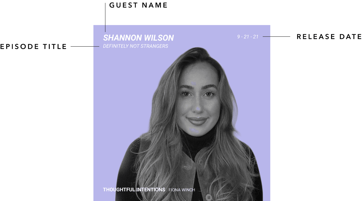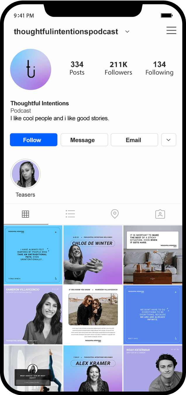 The thoughtful intentions podcast wanted templates that could be used for each guest to create some buzz across social platforms. I created an album cover like graphic that showcases an image of the guest, the episode title, and the release date. The second graphic is an introduction post to welcome the next guest before the episode is released. Finally I designed a graphic that could display a quote that is used during an episode or pertains to the topic discussed.